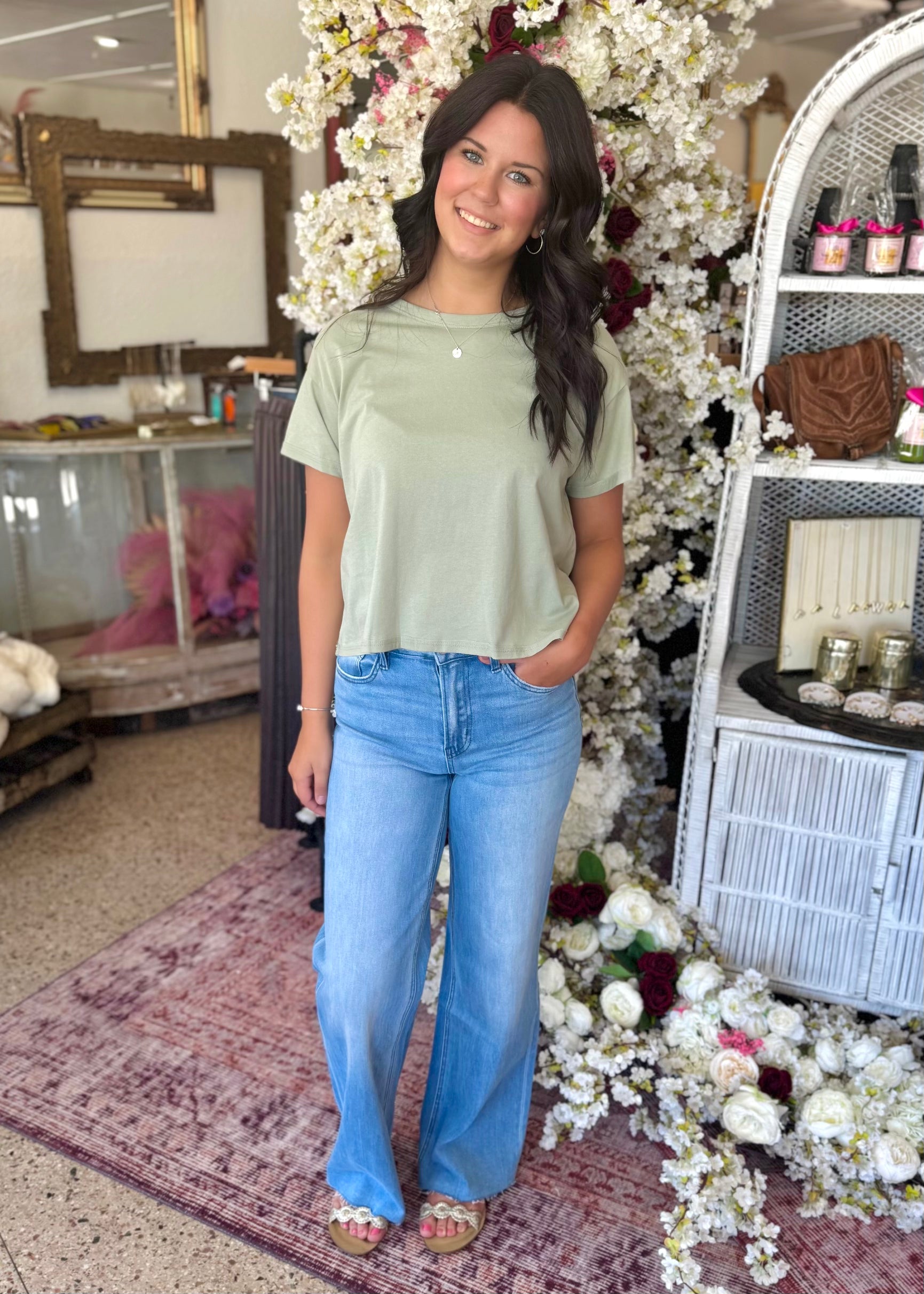 Comfort stretch denim, super high rise waist, clean cut raw hem, full length, wide leg jeans